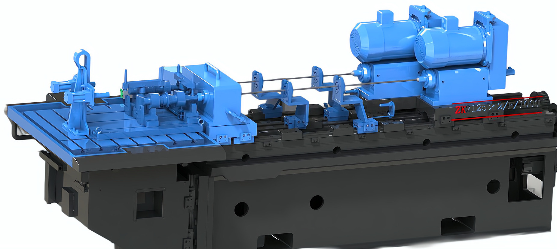簡要說明:機(jī)床主機(jī)分為左右兩體。左體為升降+水平移動工作臺。右體為鉆桿床身、鉆桿主軸箱、導(dǎo)向排屑箱、鉆桿進(jìn)給系統(tǒng)。左右兩體共同安裝在高強(qiáng)度底座上。高壓冷卻系統(tǒng)與機(jī)床主機(jī)平行放置。整體結(jié)構(gòu)緊湊,占地面積小。操作方便。