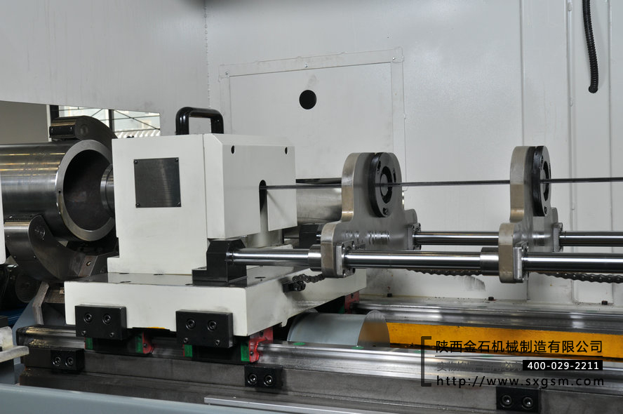 工件裝夾:工件左端用液壓卡盤(pán)夾持,右端用液壓中心架支撐。液壓卡盤(pán)和中心架可分別橫移,用于加工偏心孔。