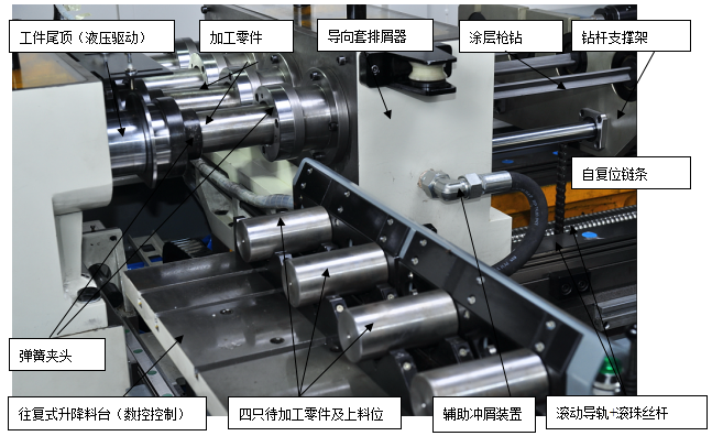 機床具備四主軸、八工位設(shè)計,工件采用彈簧夾頭通過零件外圓自動定位夾緊。機床配置伺服驅(qū)動數(shù)控控制的自動往復(fù)升降式上料臺,其料臺的數(shù)控橫移、升降以及固定的上下料區(qū)域設(shè)計,均可使機床以極好的適應(yīng)性匹配適宜的如桁架機械手或六軸機器人或功能氣缸等自動化形式,槍鉆工序的整個加工過程則在數(shù)控方式下實現(xiàn)了完全的自動化加工。