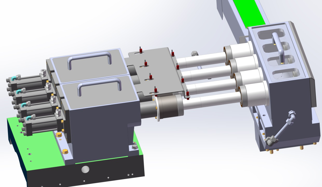 4. 左筒夾液壓驅(qū)動(dòng),從左向右伸出,將工件左端套進(jìn)筒夾內(nèi)孔,繼續(xù)向右,推動(dòng)工件進(jìn)入右端的筒夾內(nèi)孔。筒夾彈簧套收縮,夾緊工件。