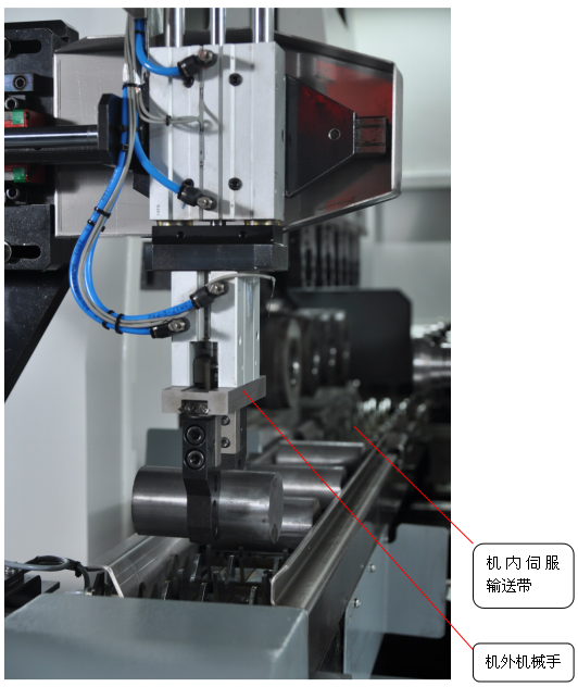再由機外機械手將工件移放至機內伺服傳送帶上。