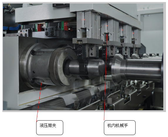 四組機內機械手一次抓取4支工件,上升,并將工件插入筒夾內孔;