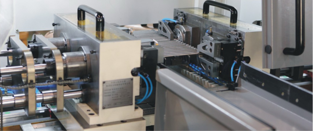 該機床采用四軸對進式加工,進口氣動自定心求心夾具裝夾,通過一次安裝即可完成高精度臺階孔的加工,并具備極高的入口位置精度。機床自動上料機構(gòu)單次最大安裝工件數(shù)量為22只,極大縮減了機床加工的輔助時間,效率極高。其一個加工循環(huán)的時間跨度合理,便于工廠進行人員及生產(chǎn)安排,并大幅降低了工人勞動強度。