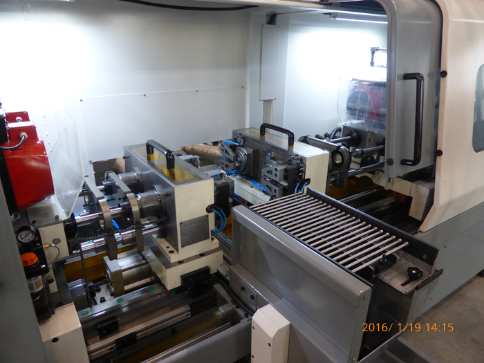 為了降低操作者勞動強度,該機床配置了自動上下料機構。該機構數控控制,一次安裝28支工件。送入加工區域后,機床會自動依次加工,直至完成所有28支工件的加工。送料架再退出加工區,由人工將成品取走。