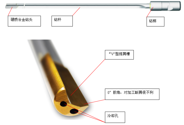 通常槍鉆都是采用釬焊式的制造工藝,一般由鉆柄、鉆桿、鉆頭三部分焊接在一起。槍鉆中間有一通孔,是切削液進入切削區的通道。